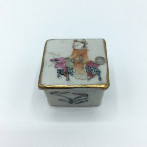 Diminuitive Chinese Porcelain Covered Box with Painted Motif of a Boy Riding a Qilin (#18-034)